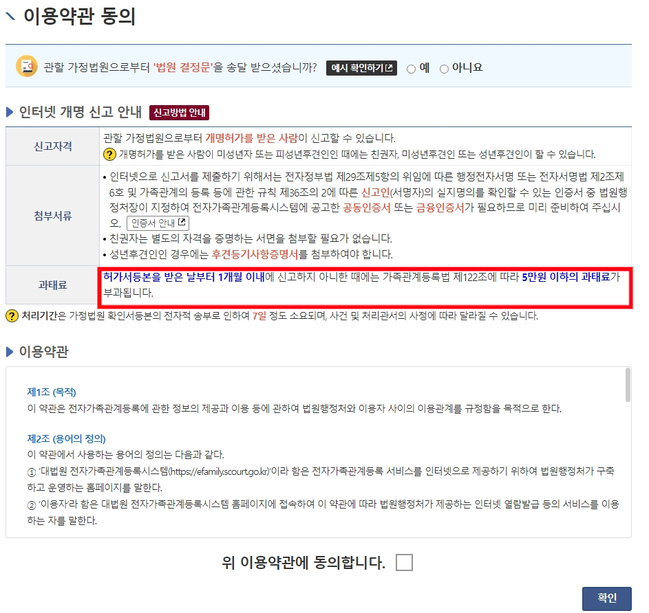 개명 클릭하시면 아래와 같은 화면이 나오는데, 온라인에서 할경우 반드시 "공동인증서(구 공인인증서)"가 필요합니다. 개인정보를 인증해야하기 때문에 꼭필요합니다. 앞서 말씀드린것과 같이 결정문을 받은날로 부터 1개월이내 신고를 하지 않을시 5만원이하 과태료 부가 된다는 안내 사항이 나와있네요
