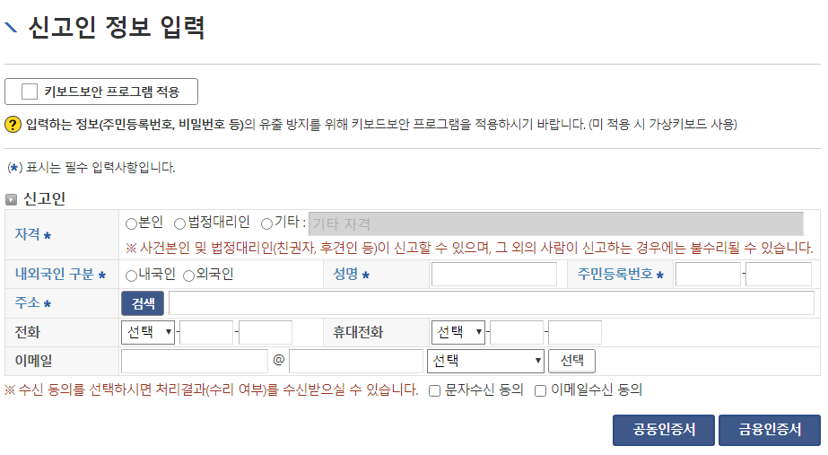 개명 클릭하시면 아래와 같은 화면이 나오는데, 온라인에서 할경우 반드시 "공동인증서(구 공인인증서)"가 필요합니다. 개인정보를 인증해야하기 때문에 꼭필요합니다. 앞서 말씀드린것과 같이 결정문을 받은날로 부터 1개월이내 신고를 하지 않을시 5만원이하 과태료 부가 된다는 안내 사항이 나와있네요