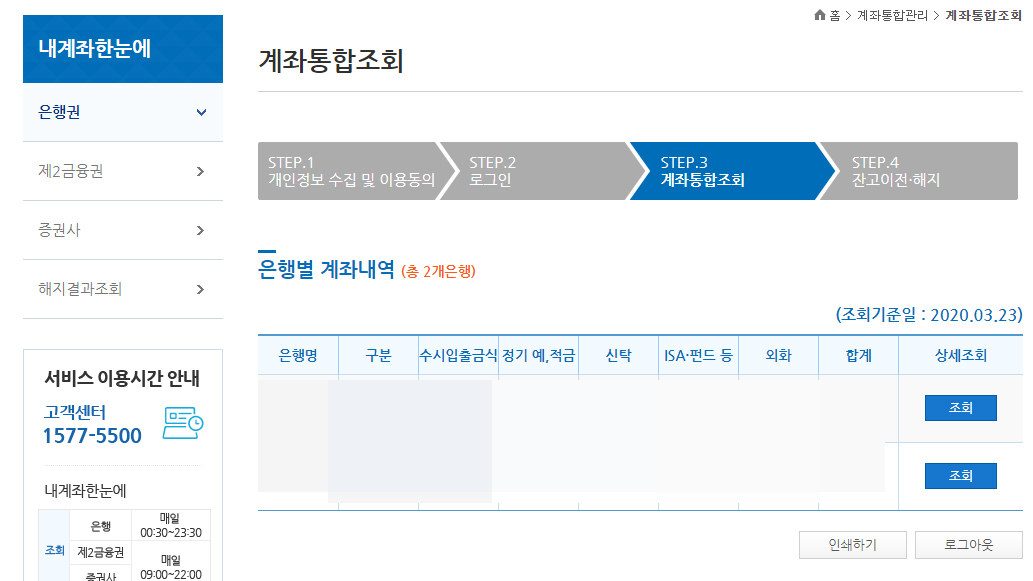 들어가면 은행과 몇 계좌인지 그리고 신탁이나, 적금 펀드가 있는지 모두 확인할수 있습니다.