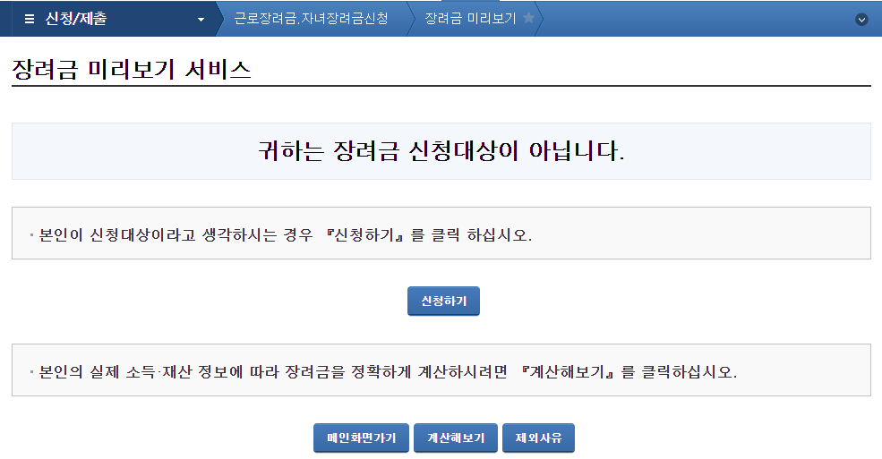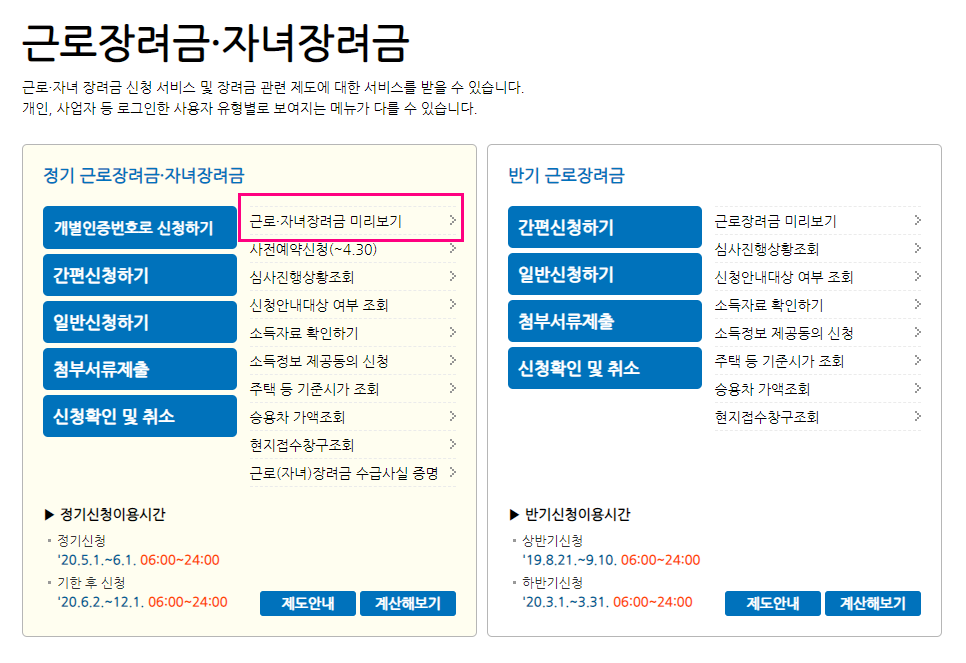 지금 "정기 근로장겨금.자녀장려금" 신청 기간이기 때문에 "미리보기" 화면이 있습니다.