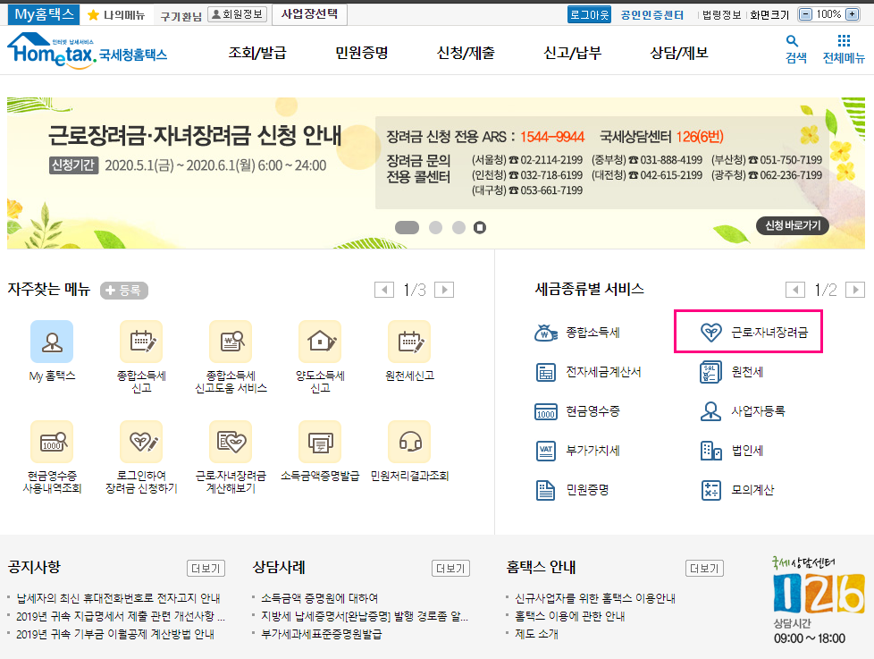왼쪽하단에 보시면 "근로.자녀 장려금" 카테고리가 보입니다 바로 클릭 클릭!!