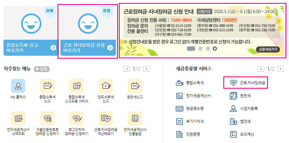 왼쪽하단에 보시면 "근로.자녀 장려금" 카테고리가 보입니다 바로 클릭 클릭!!