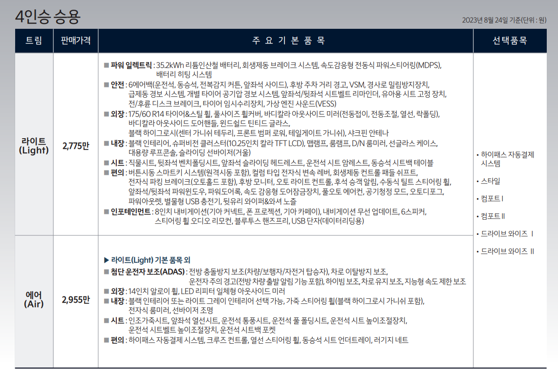 24년형 기아 레이 EV 가격과 차량 제원 그리고 포토를 정리해 보겠습니다. 특이한 점은 레이는 상업용으로 이용하신 분들이 많기 때문 4인승, 2인승, 1인승으로 나눠져서 가격표가 있으니 자세히 보시기 바랍니다.