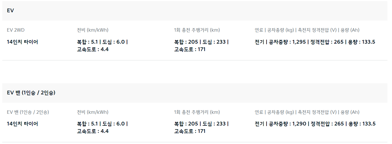 2. 기아 레이 EV 제원 정보