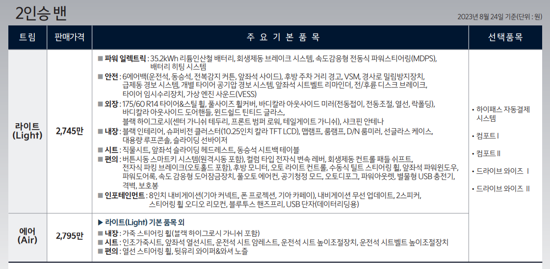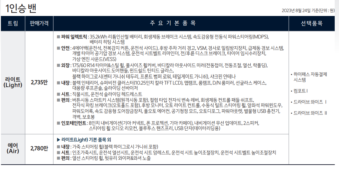 트림은 2가지로 나눠져 있으며, 몇 인승인지에 따라 가격이 조금씩 차이가 납니다. 승용 외에 상업용으로 이용하신분들도 많기 때문에 밴도 2가지 종류가 있습니다.