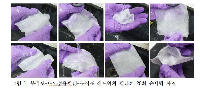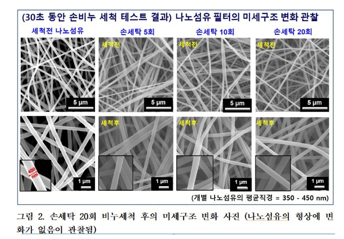 실제로 실험결과를 보면 20번 세탁 후에도 나노섬유 마스크는 우수한 필터 기능을 유지하고 한다고 합니다.