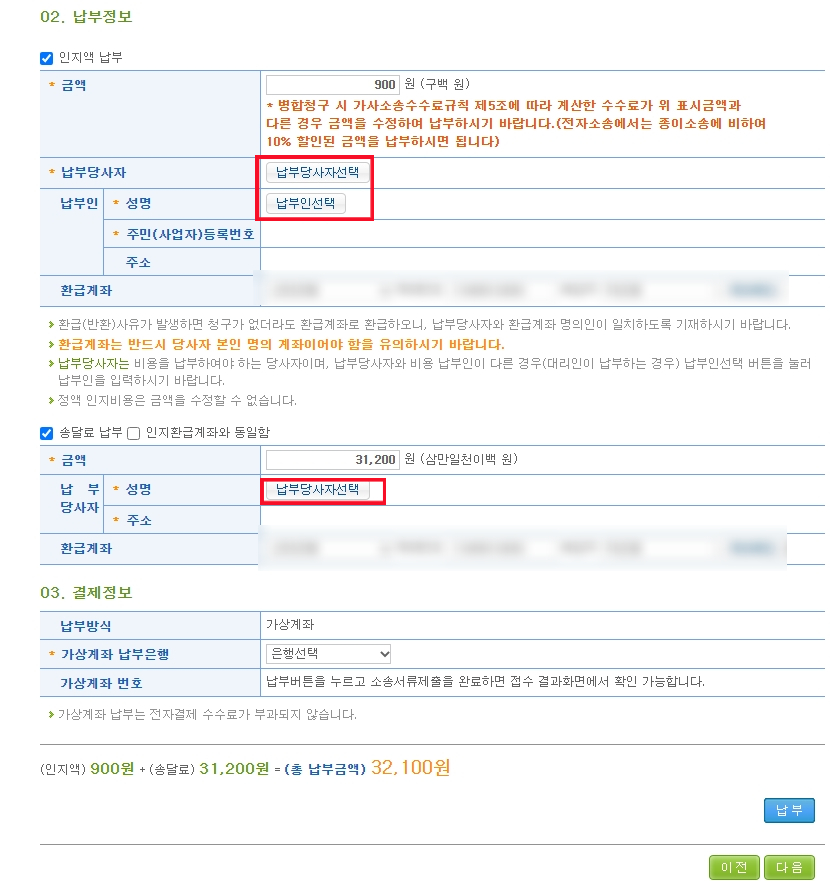 마지막으로 비용 납부입니다. 총비용은 32,100원 나왔는데 인지 900원 송달료 31,200원 입니다. 당사자 선택에서 본인에 이름을 입력하시고 납부인또한 개명신청자 이름을적어주시면되며, 환계좌는 꼭 활성화 된 계좌를 입력하셔야 나중에 송달료가 남으면 환급이 됩니다.