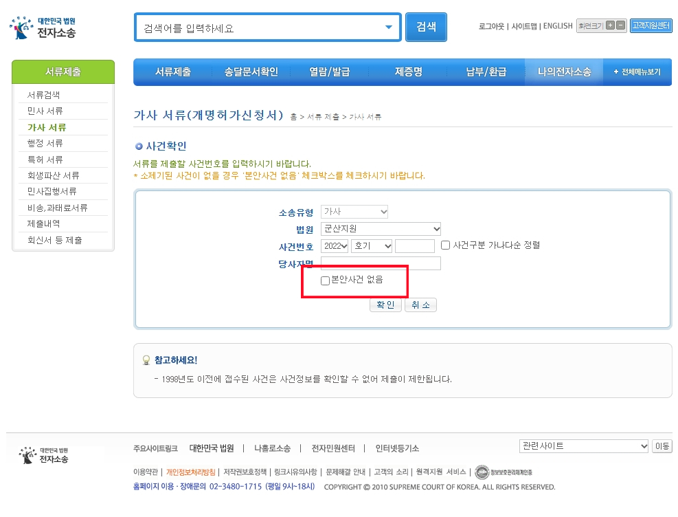 본안사건 없음 체크하고 확인 누르시면됩니다.