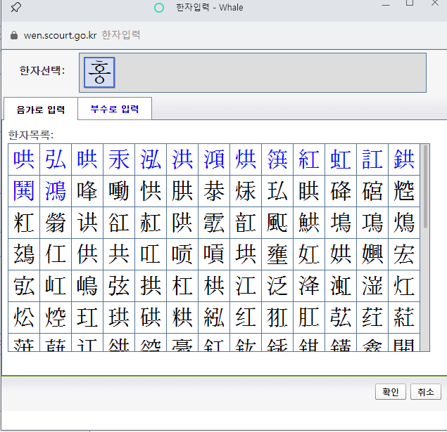 한자 입력을 클릭하면 아래와 같이 인명사전에 맞는 한자가 쭉나옵니다. 이름한자가 클리면 안되기 때문에 한번 두번 세번 꼭 확인하신후에 마무리 해주시기 바랍니다.