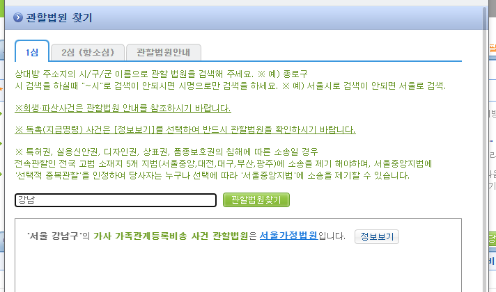저는 강남을 예시로 작성해보니 서울가정법원이 관할이 되네요