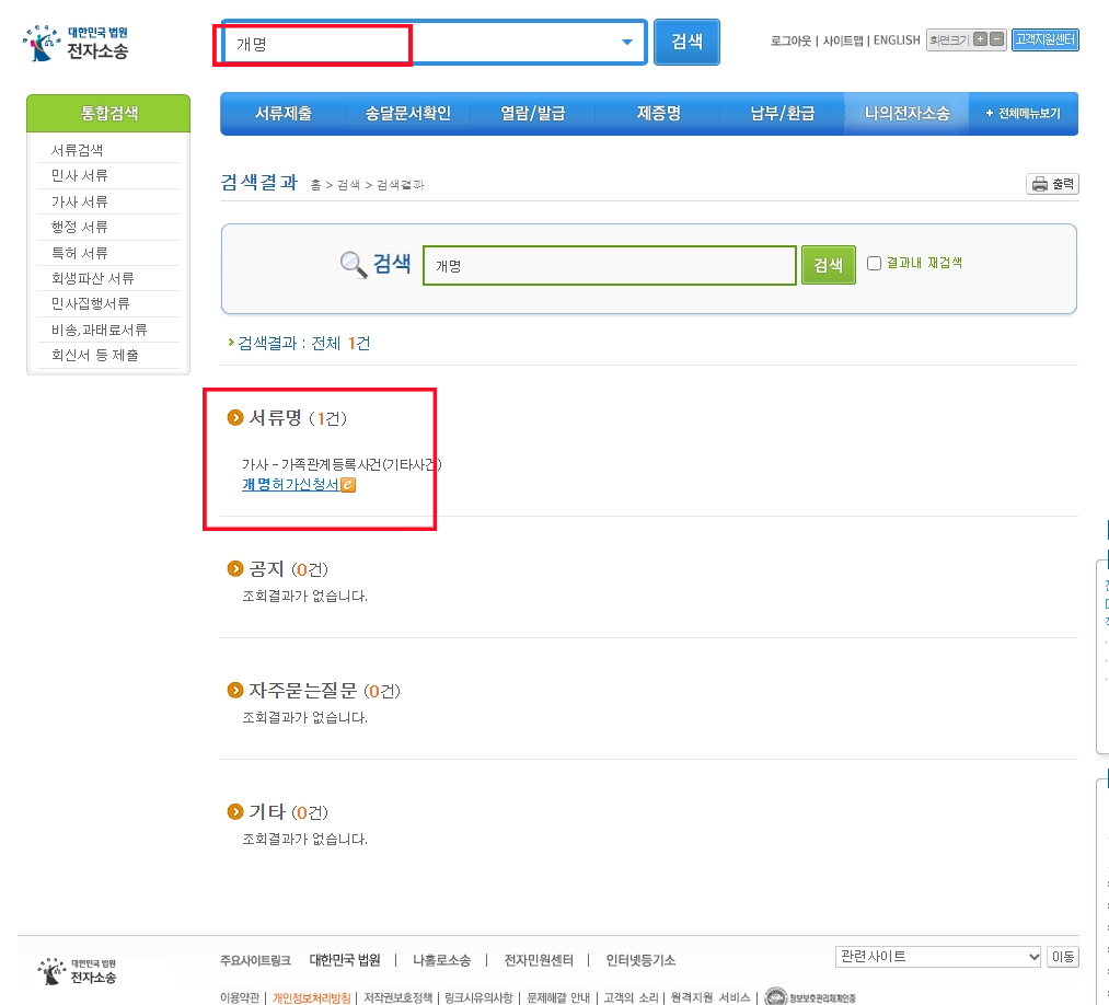 여기서 개명접수 서류를 카테고리 타서 들어가기가 어렵기 때문에 검색창에다 "개명"검색하시면됩니다!