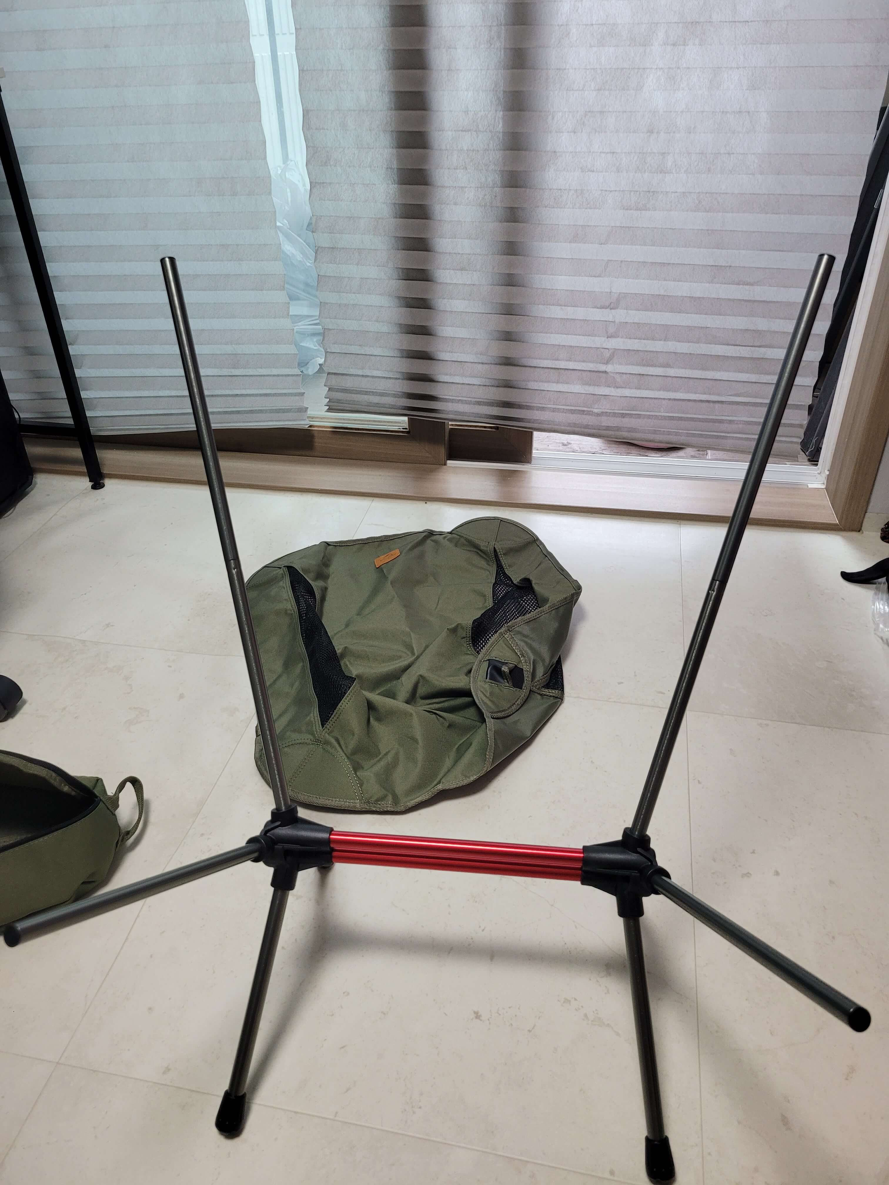 의자에 폴대를 끼워서 피는 방식으로 다접으면 파우치 정도 사이즈 밖에 안되더라고요