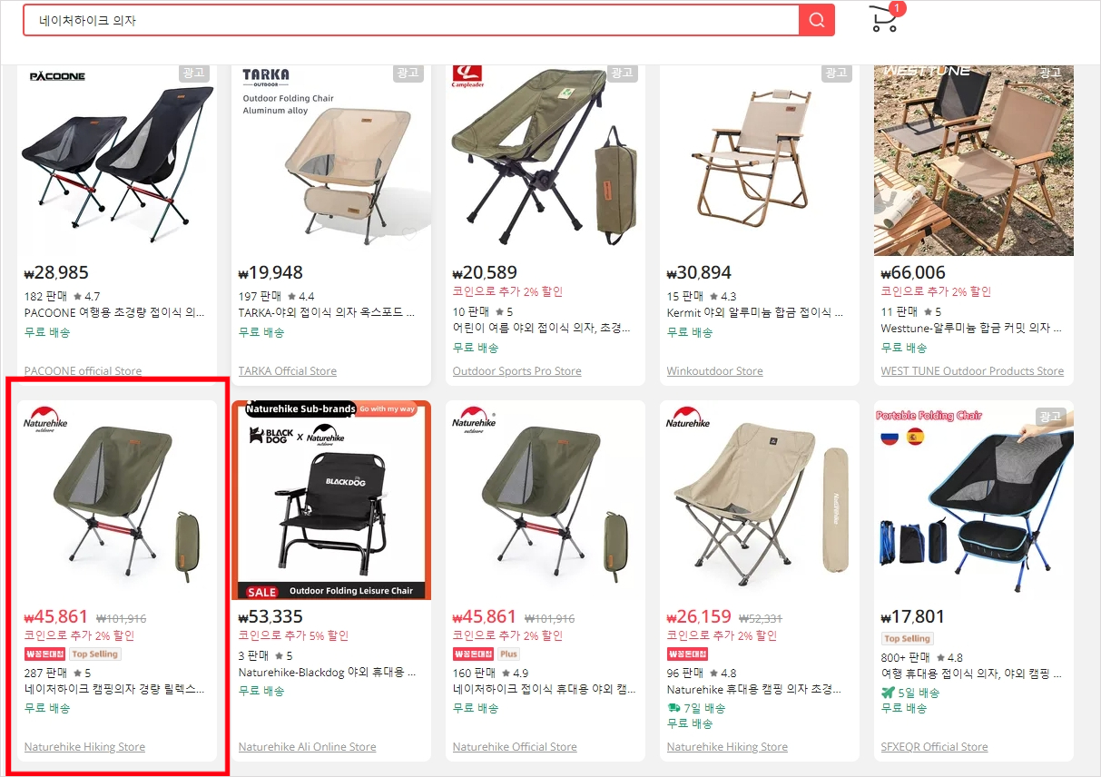 가격은 대륙을 따라갈수가 없어 알리익스프레스 검색을 해봤는데 네이처하이크라는 캠핑 브랜드가 보이더라고요