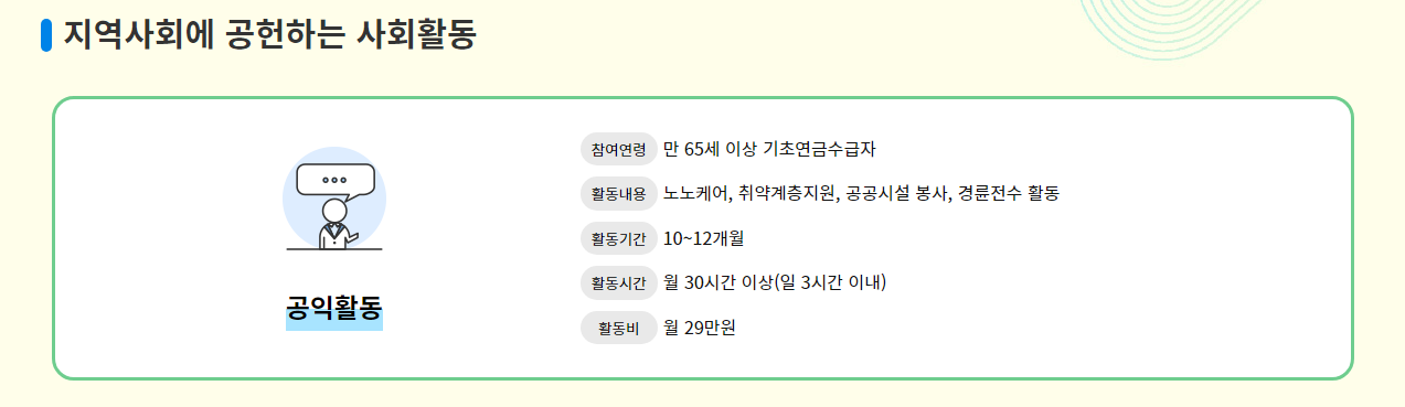 말 그대로 저역사회에 공헌하는 사회활동을 하는 일자리로, 참여연령은 만 65세 이상 기초연금수급자이고, 활동기간은 10~12개월, 활동시간은 월 30시간 이상(일 3시간 이내)이며, 활동비는 월 29만 원입니다.
