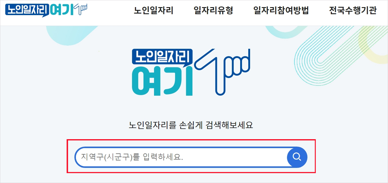먼저 검색 포탈에서 "노인일자리 여기"라고 검색 하면, 아래와 같이 노인 일자리 정보 사이트가 나옵니다.