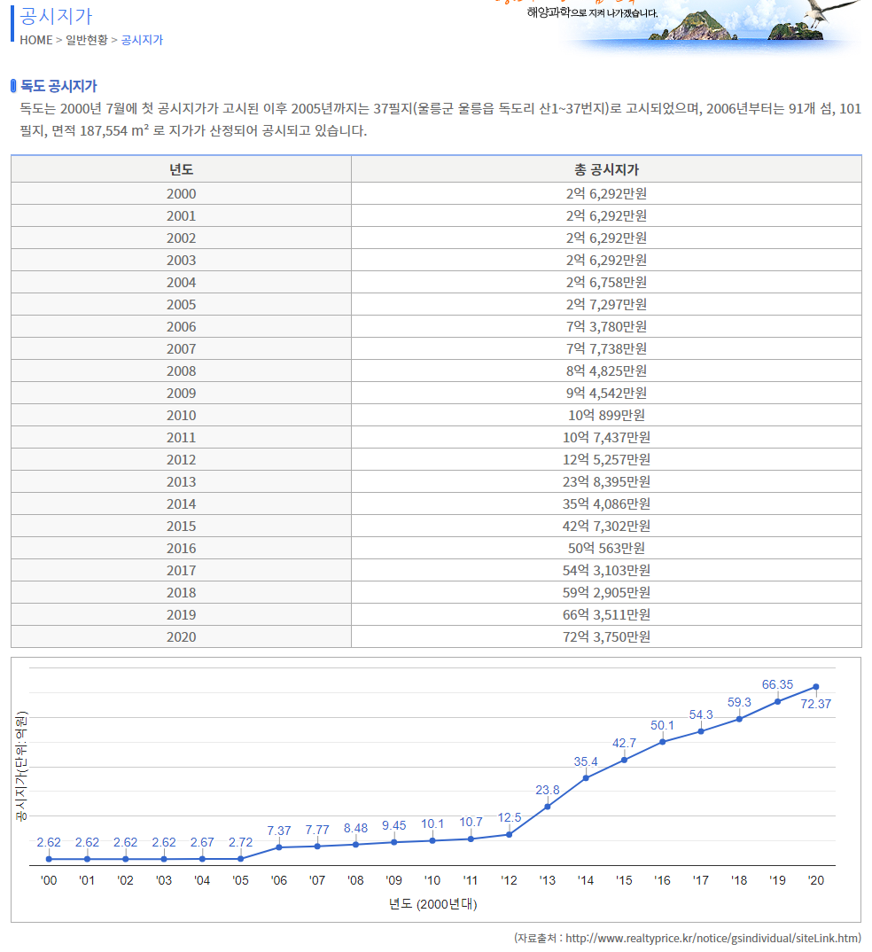 그리고 독도의 공시지가 아시다시피 공시지가는 매년 올라가는데 독도에 가치를 매길수 없을정도루 소중한 우리나라 땅이지만 대략 공시지가는 이렇다고 하니 한번 재미로 확인하세요^^