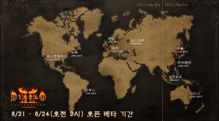 오픈 베타 시작 8월 21일 오전 2시부터 8월 24일 오전 2시까지 진행하며 모든 플랫폼에서 플레이 가능 하며, 디아블로 구매하신 모든 사람이플레이 가능하다고합니다.