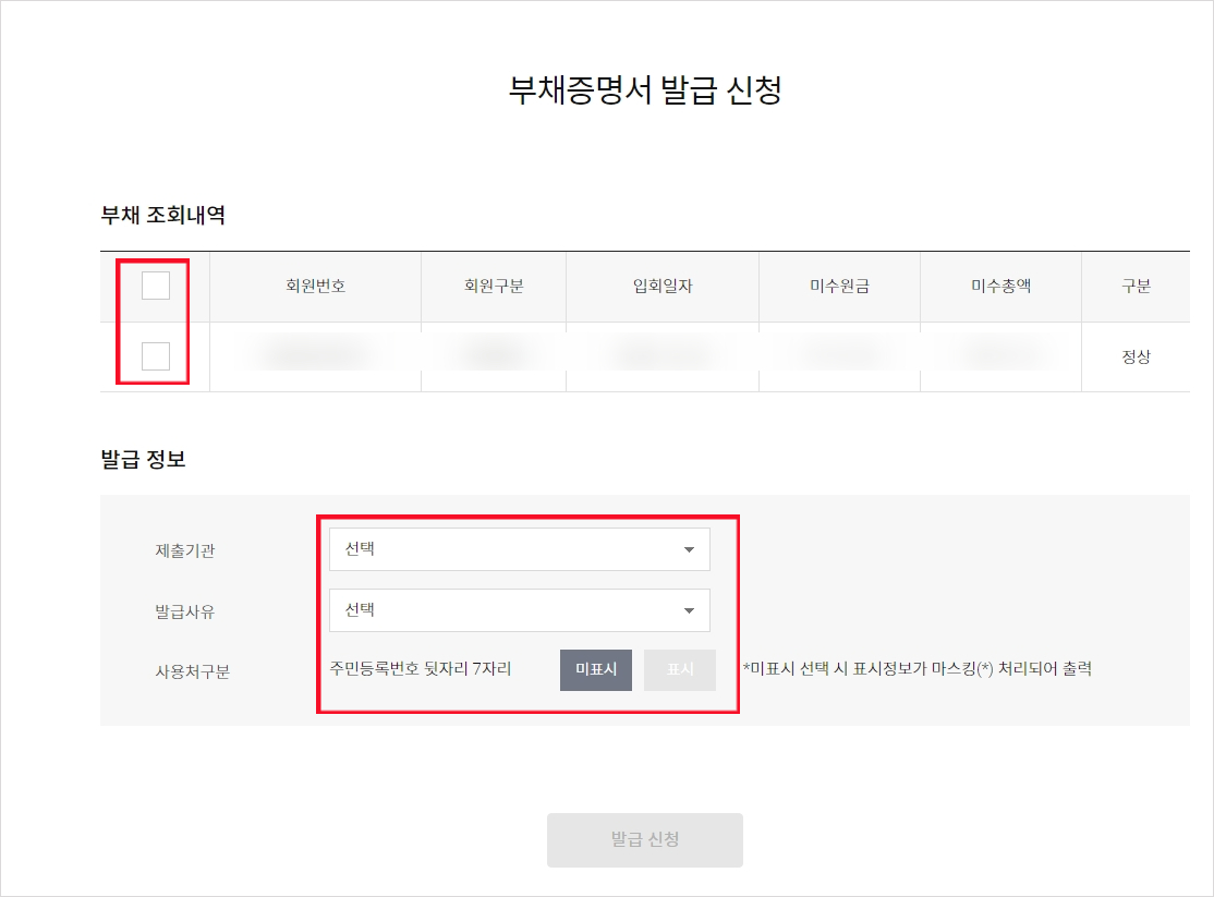 부채증명서 발급 신청을 하게 되면, 발급신청서 화면이 나오고 간단한 안내사황이 나와있으니 읽어보신 후에 "조회"버튼을 클릭하시면 됩니다. 조회 버튼을 클릭하게 되면, 부채증명서 발급 신청이 나옵니다. 현재까지 사용한 카드의 부채 조회내역이 나오게 되며, "회원번호, 회원구분, 입회일자, 미수현금, 미수금액, 구분" 등의 내용을 확인할 수 있으며, 반드시 제출기관과 발급 사유를 체크하셔야지만 다음 화면으로 넘어가게 됩니다.