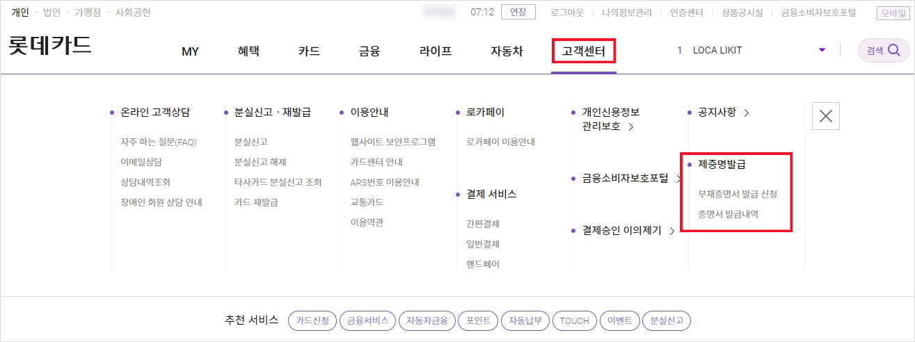 1.롯데카드 부채증명서 (금융거래잔액확인서) 발급 방법