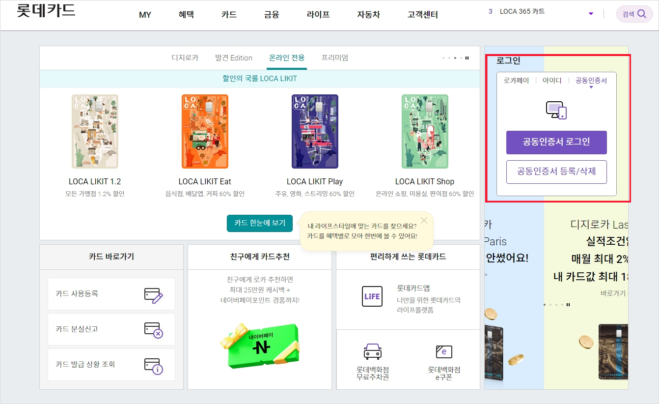 먼저 롯데카드 홈페이지에 접속합니다. 롯데카드 홈페이지에 접속하시면 로그인을 해야하는데 "로카페이, 아이디, 공동인증서" 3가지 방법으로 로그인이 가능합니다. 아이디나 로카페이가 별도로 없기 때문에 공동인증서를 통한 로그인을 해야 됩니다.