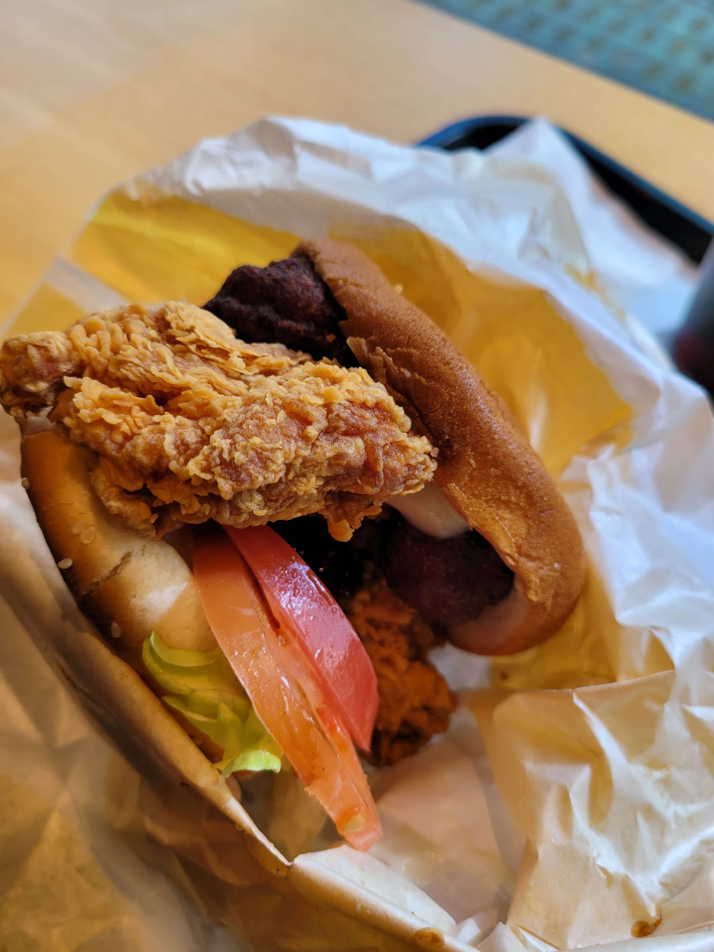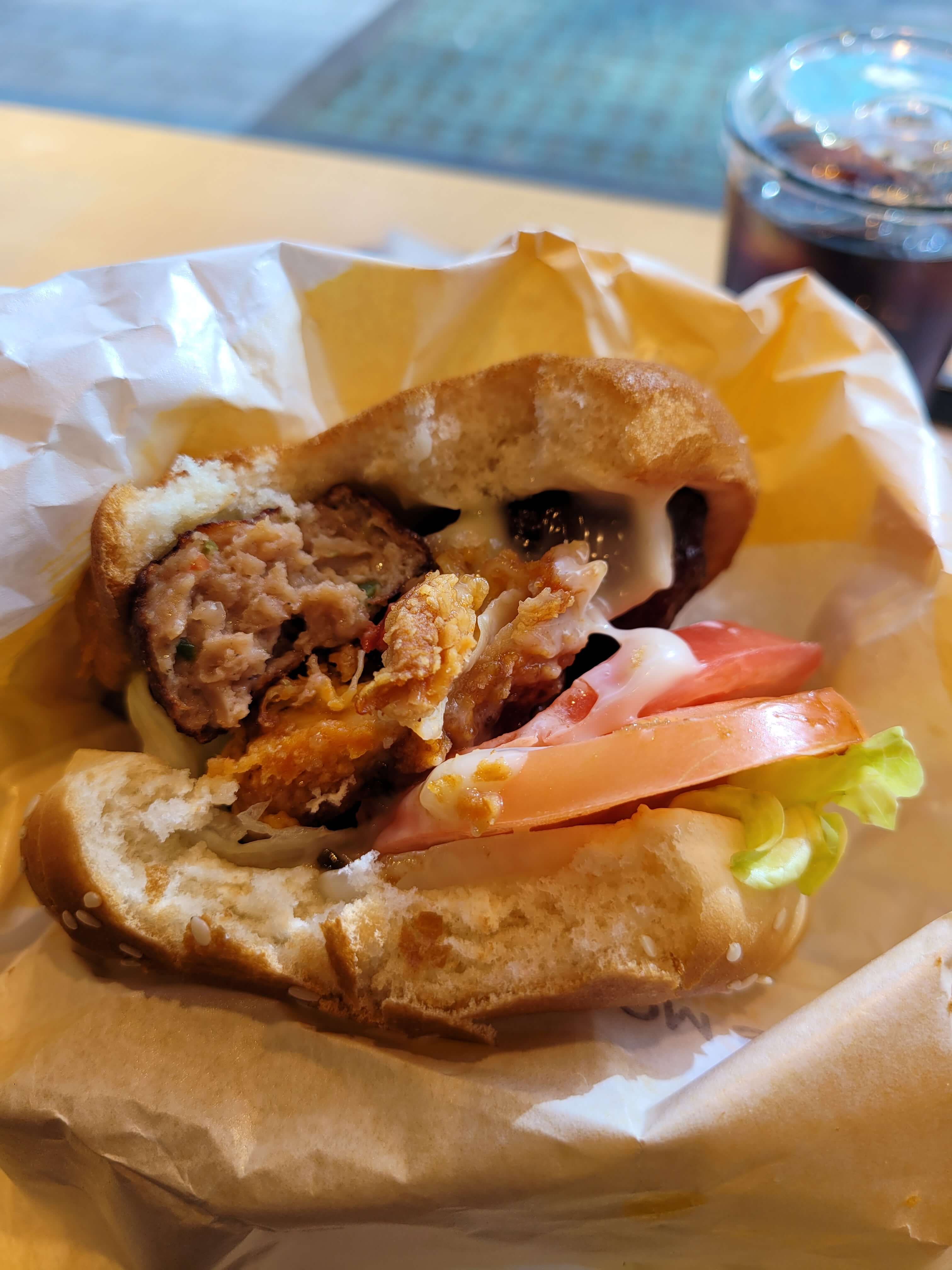 미트볼에 닭버거 패티에 토마토 양상추 양파 들어가있는데 아마 누르지 않았으면 더크게 나왔을거 같네요