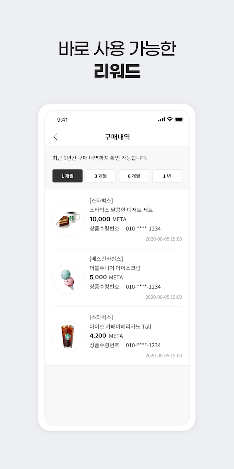 - 받자마자 사용 가능한 리워드, 기프티콘/현금으로 바꿔보세요.