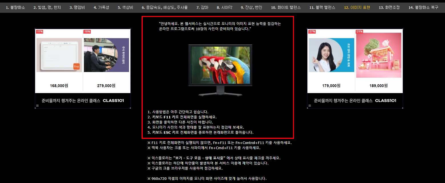 먼저 f11를 눌러 전체 화면으로 만들고 클릭하시면 14단계의 테스트 순서대로 진행되며, 미묘한 밝기 구분이 가능합니다. 테스트 색상에 맞춰 모니터 옵션을 켜서 조종하시면됩니다.