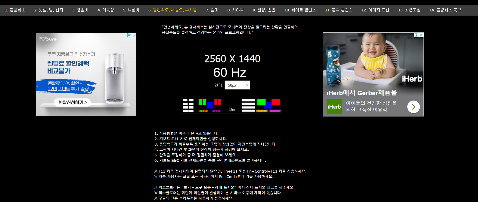 해당 사이트에서는 "불량화소,멍,가독성,색상비,응답속도,해상도,주사율"등 13가지 기능에 대해서 테스르를 할수 있습니다.
