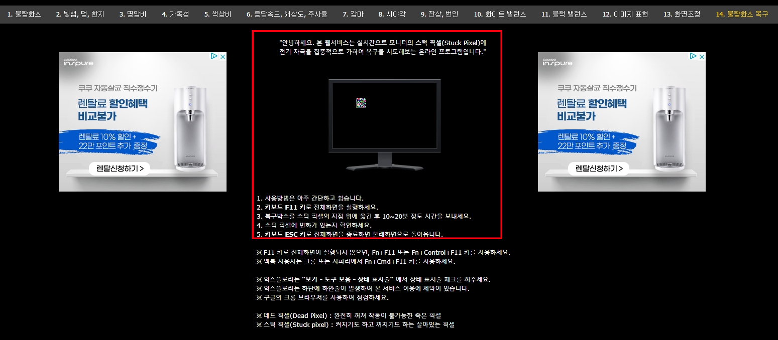 먼저 f11를 눌러 전체 화면으로 만들어서 들어가면 복구박스를 스턱빅셀의 지점위에 옮긴후에 10~20정도 기다립니다. 스턱필셀에 변환가 있는 확인합니다. 불량화소가 있었으면 한번 해보겠지만 불략화소가 없어서 해당 기능이 있다는것만확인시켜드리겠습니다.