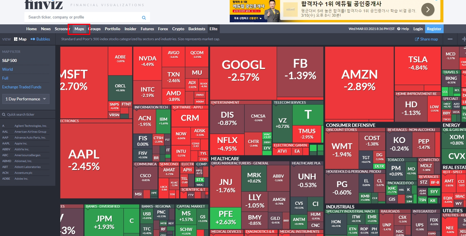 사이트 부분에서 maps 클릭하면 전체적으로 전날 주식이 올랐는지 떨어졌는지 확인할수 있습니다.