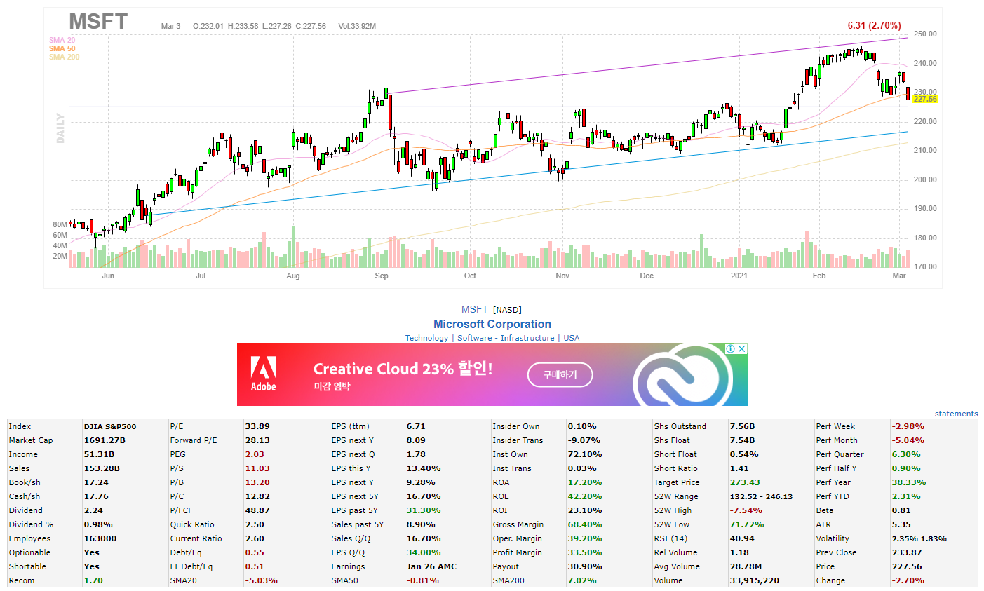 우리나라에서도 잘알고 있는 기업 마이크로소프트[MSFT] 애플[AAPL] 등등 있는데 전날 많이 떨어져서 빨간불이 많이 들어왔네요