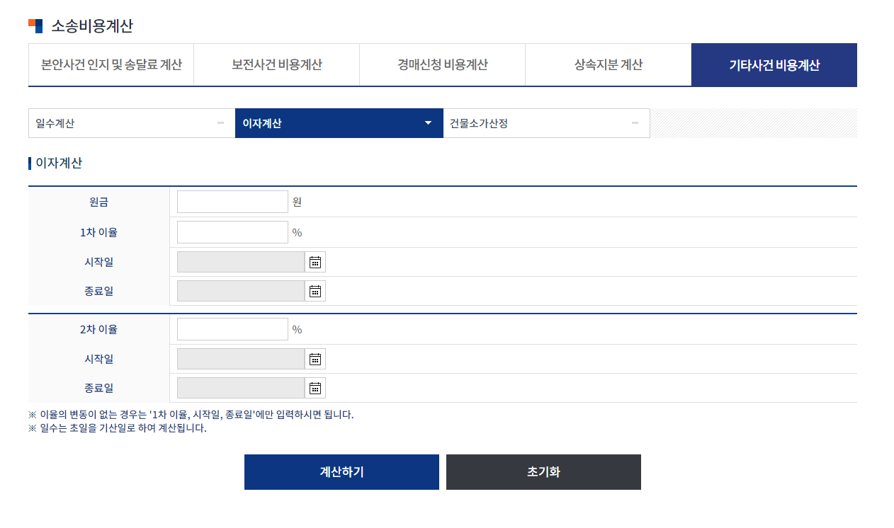 소송비용 자동계산기를 클릭하면 아래와 같은 화면이 나옵니다.