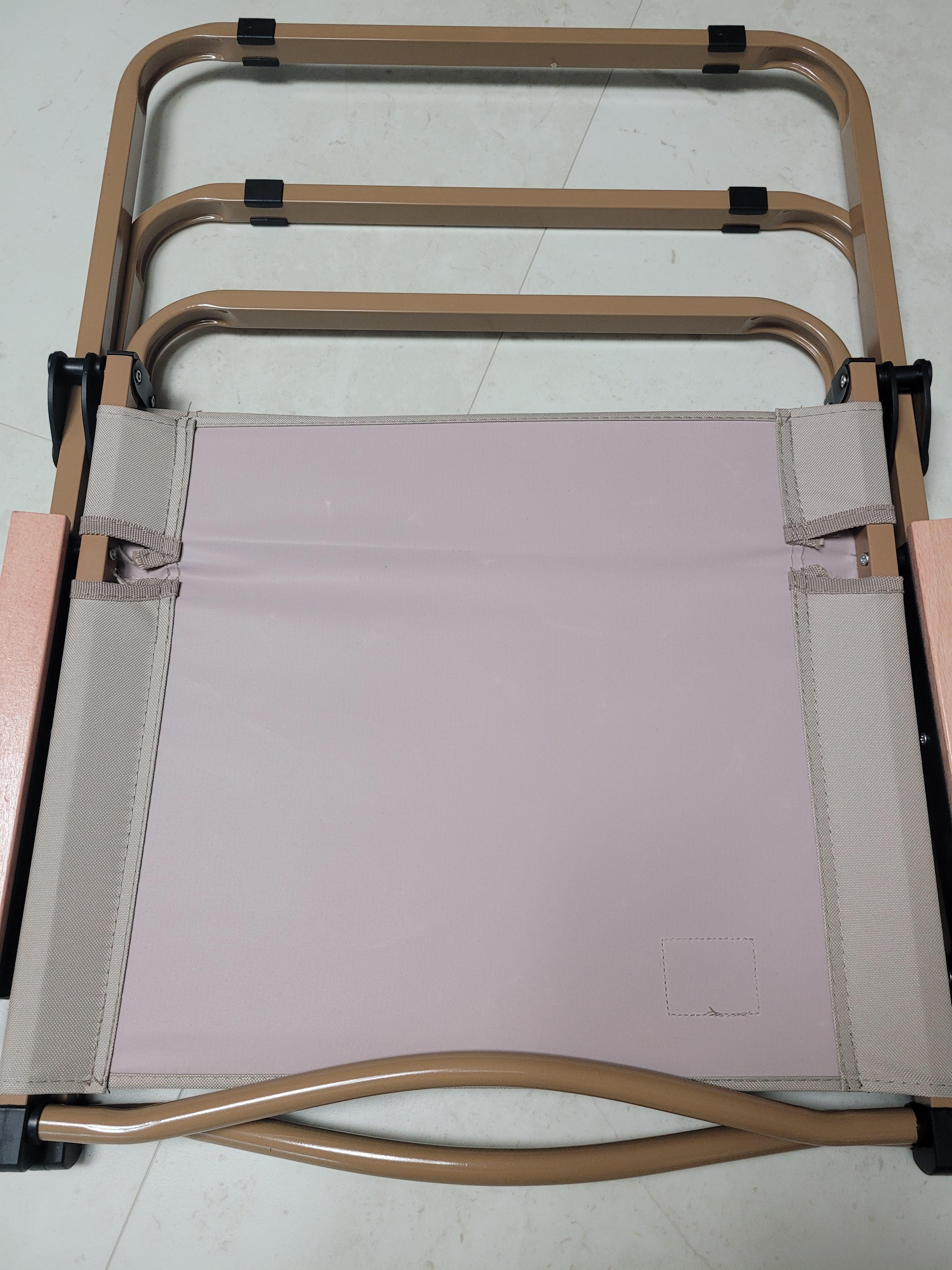접이식 캠핑의자에 등받이 부분에 브랜드로고가 박음질되어 있으며, 팔걸이는 나무로 되어있는데 플라스틱 같은 나무이고, 이음세 부분 플라스틱과 철로 되어있어서 내구성에 문제가 없을까 하는 고민이 들었습니다. 하지만 가성비를 보고 산 것이기 때문에 그것까지 바라는 것은 양심이 없는 거겠죠