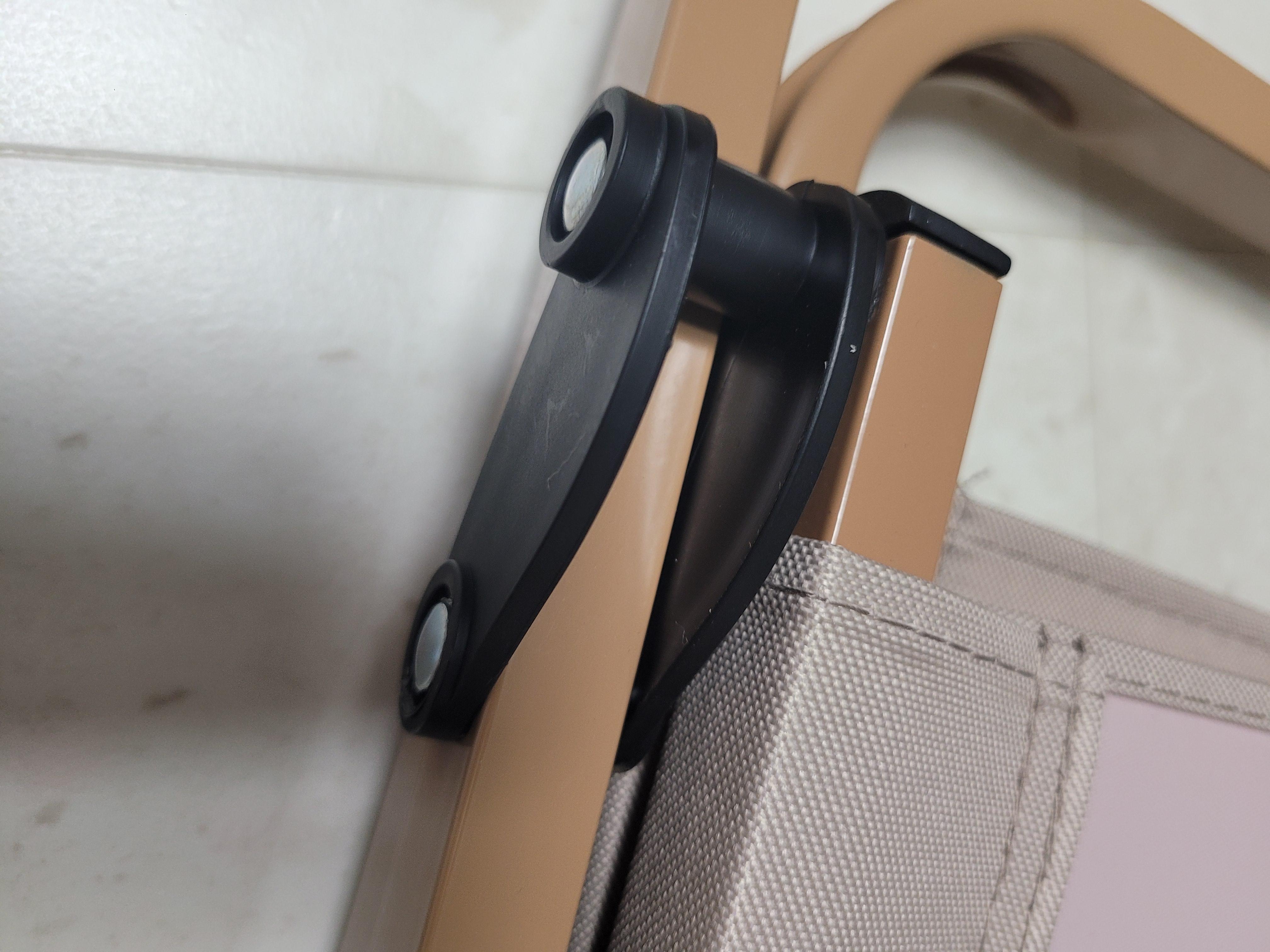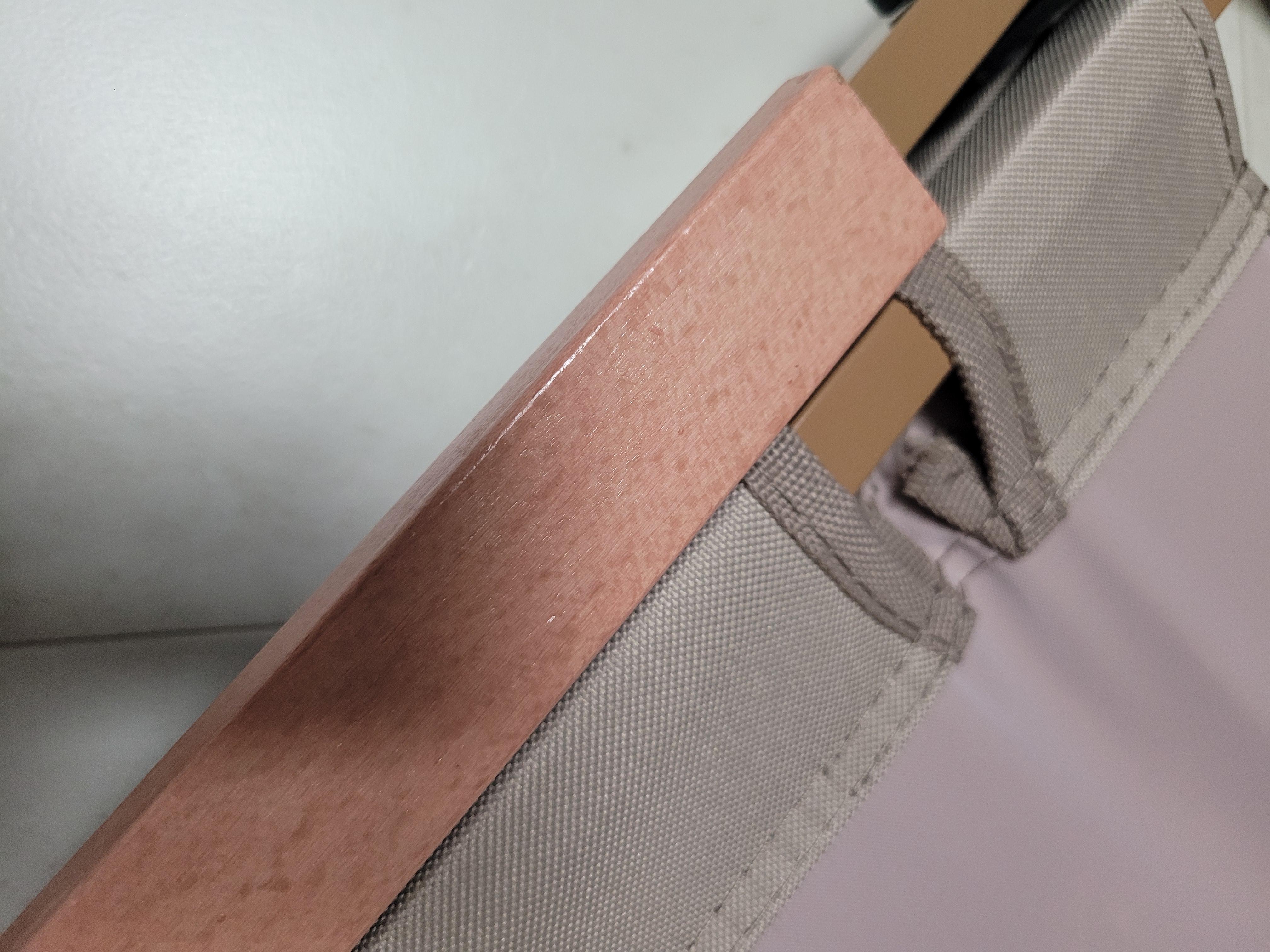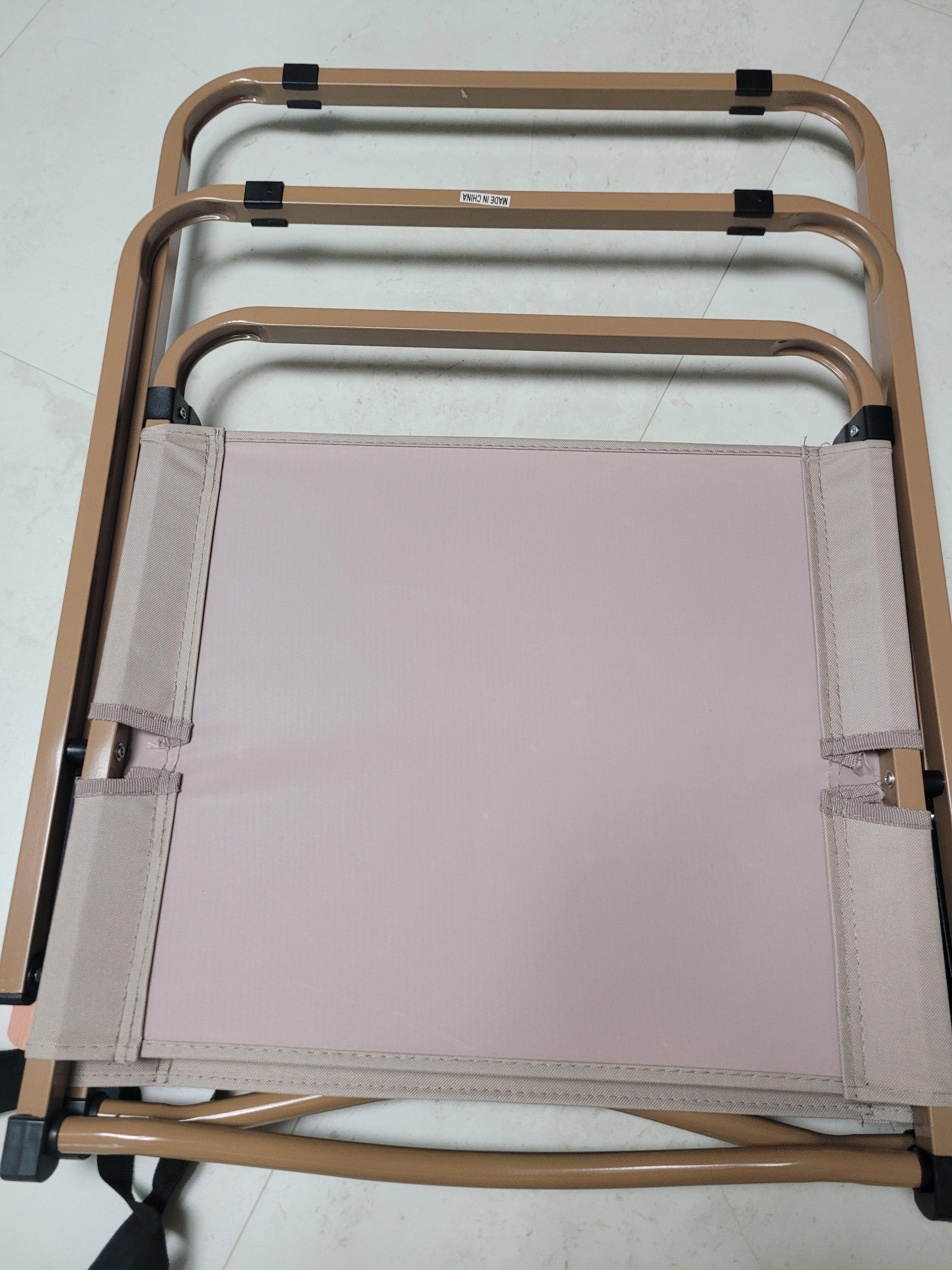 접이식 캠핑의자에 등받이 부분에 브랜드로고가 박음질되어 있으며, 팔걸이는 나무로 되어있는데 플라스틱 같은 나무이고, 이음세 부분 플라스틱과 철로 되어있어서 내구성에 문제가 없을까 하는 고민이 들었습니다. 하지만 가성비를 보고 산 것이기 때문에 그것까지 바라는 것은 양심이 없는 거겠죠