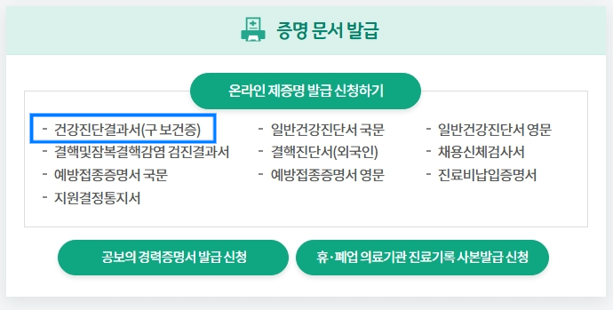 • 민간병원: 지정병원별로 보건증 온라인 발급 연계 상황이 상이합니다