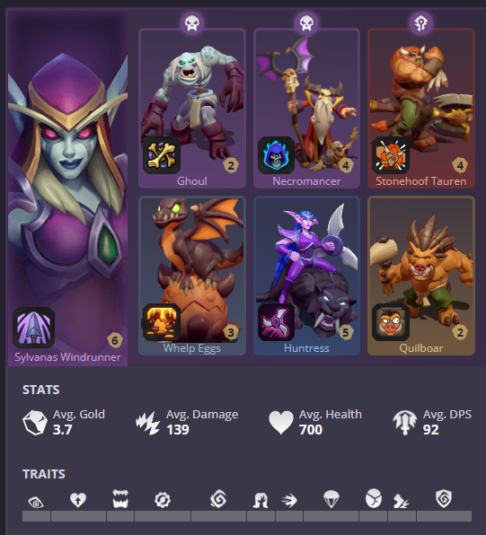 실바나스 특성 검은 화살은 이 덱에 꼭 필요합니다. 사실 검은 화살이 없다면 실바나스 사용하기 어렵습니다. 게임 초반에는 타렌 과 퀼보어를 사용하여 보물 상자를 노립니다. 그리고 구울,타렌,퀄보어 탱커 뒤에 실바나스를 배치합니다. 네크로맨서가 지속적은 스켈렛톤 소환으로 전투의 지속성을 높여주며 타워 방어시에는 타워 뒤에 배치하여 생존률을 높여줍니다. 헌트리스는 공중 유닛을 제압하는데 사용하면됩니다. 그리고 드래곤의 알은 금광이나 보물상자를 방어하는데 사용하면 됩니다. 대부분 얻기 쉬운 미니 들이기 때문에 덱구성은 쉽게할수 있으나, 실바나스 특성이 없다면 실패하기 쉬운 조합입니다.