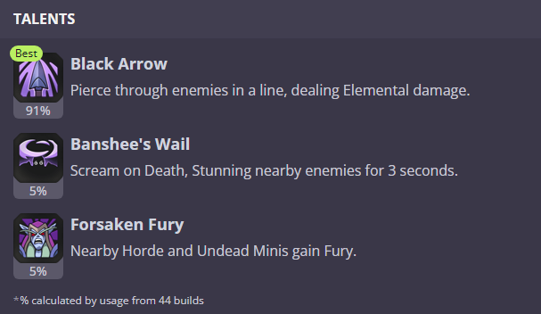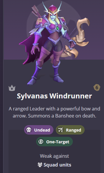 실바나스 윈드러너는 언데드 유닛으로 원거리 딜러에 하나에 유닛을 공객하는 미니입니다. 특성으로는 벤시를 소환하며, 리더 능력으로는 주위에 있는 모든 언데드 유닛의 이동속도롤 30%로 증가 시켜줍니다. 특성으로 가장 인기 있는 특성이 블랙 에로우 인데 화살을 일렬로 발싸하여 그안에 있는 모든 미니에게 원소피해를 줍니다. 단일 타겟 유닉이지만 특성을 얻게 되면 범위 원거리 딜러가 되기 때문에 좋은 스킬입니다. 아직 저도 사용 해보지 못했서 감이 없지만 기술 설명으로는 매우 좋아보이네요.