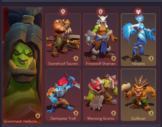 실바나스 윈드러너 (리더), 샤를가 레이저플랭크(리더), 드라크키사트 장군 (지도자), 케인 블러드후프 (리더), 제이나 프라우드무어(리더), 스털링스, 엑스큐트, 워송 레이더, 스켈레톤, 홀리 노바, 오그레 마법사, 다크 아이언 마이너, 풋맨, 독수리, 워송 그룬츠, 골렘 수확, 랩터스, 멀록 타이드헌터스