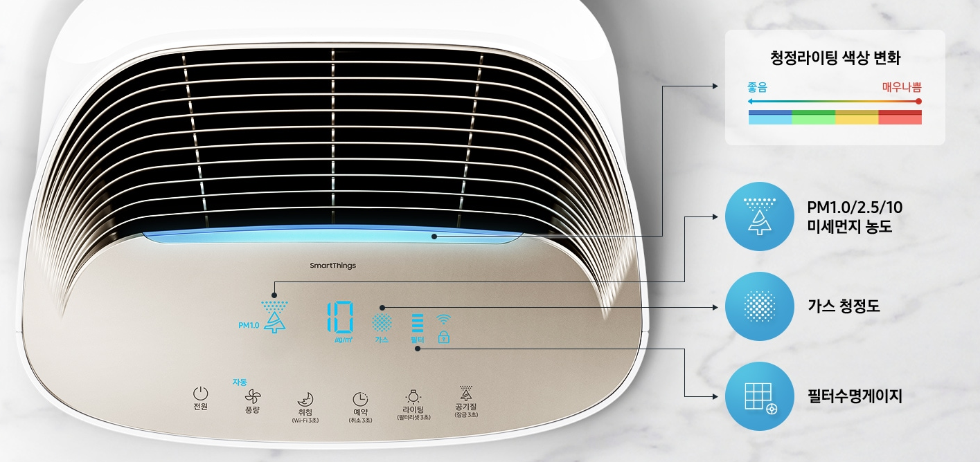 요즘은 일반적인 기능이기는 하지만 먼지 농도 가스 농도등 청정도를 확인하고, 이를 통해서 색을 표시하는 기능도 부가 되어있습니다.