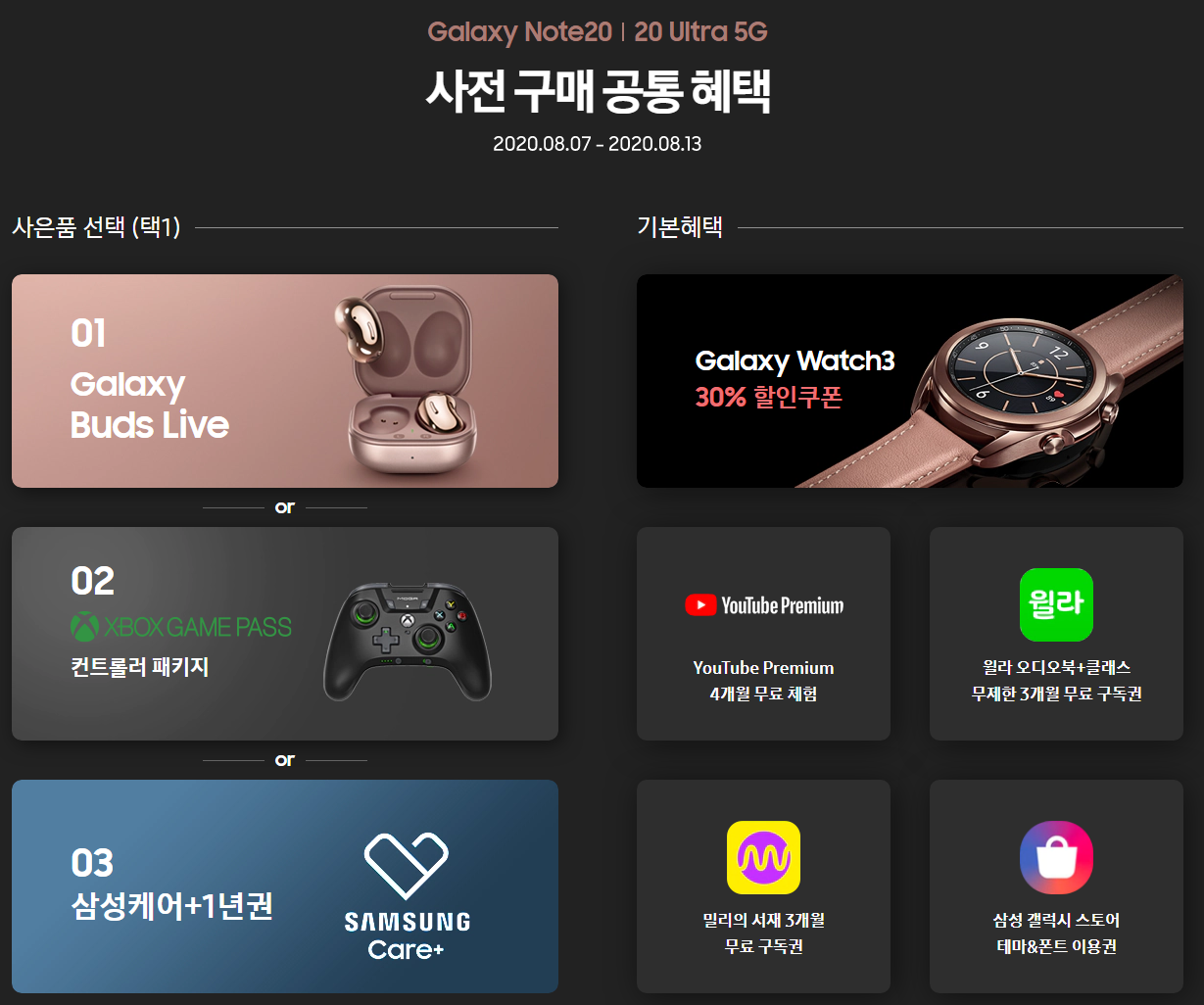 사은품 선택은 "겔럭시 버즈 라이브","xbox game pass","삼성케어+1년권" 중 한개를 선택해서 받으실수 있으며, 기본 혜택은 겔럭시 워치3 30% 할인 쿠폰 과 유튜브 프리미엄 4개월 체험권 월라 3개월 체험권, 밀리의 서재 3개월 구독권 과 삼성 스토어 테마&폰트 이용권 등이 있습니다.