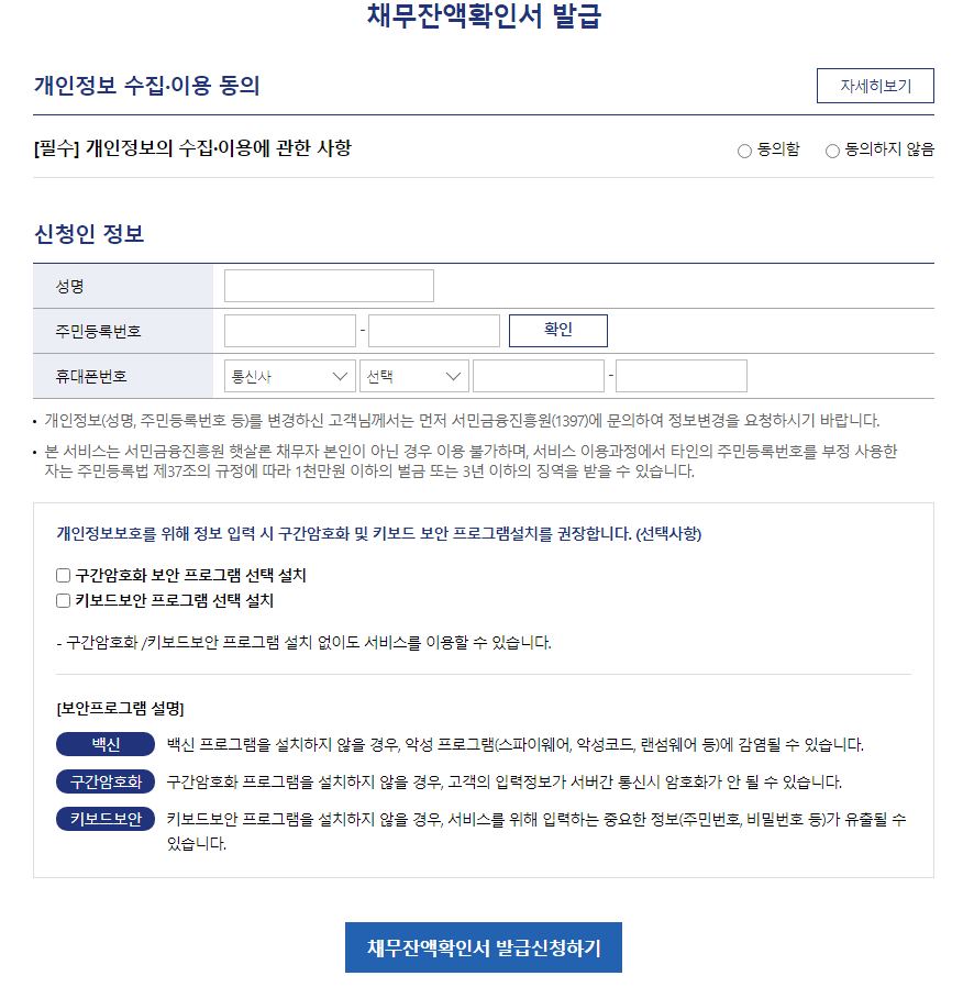 채무잔액확인서 발급 화면이 나오는데 기본정보 인증을하고, 여기서 중요한것은 "핸드폰 인증"을 하기 때문에 반드시 핸드폰을 들고 있어야합니다. 인증 절차가 끝났다면 바로 채무잔액확인서 발급 신청하기 클릭!!