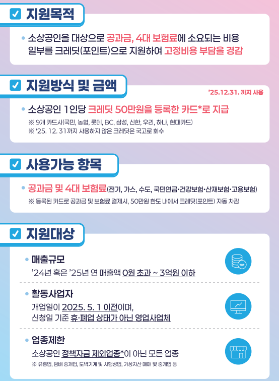 전기, 가스, 수도요금, 4대 보험료 등 고정비 부담을 크레딧(포인트)로 지원하여 소상공인 경영 안정화