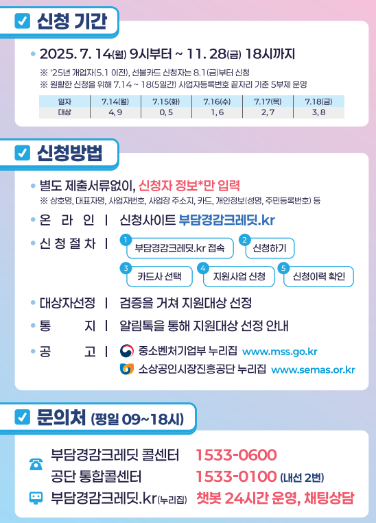 신청 조건은 연 매출 3억원 이하, 2025년 5월 1일 이전 개업, 정상 영업 중인 소상공인이라면 누구나 가능하며, 온라인으로만 신청할 수 있고 본인 명의 카드 등록이 필수입니다. 7월 14일부터 신청이 시작되어 11월 28일까지 접수받으니, 조건에 해당하는 소상공인이라면 놓치지 말고 신청하시기 바랍니다.