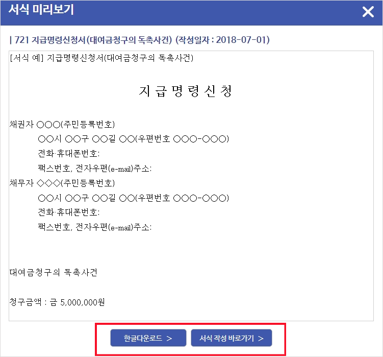 사이트 내에 지급명령신청서를 클릭하시면, 한글 프로그램으로 작성하거나, 웹사이트 상에서 바로 작성가능합니다.