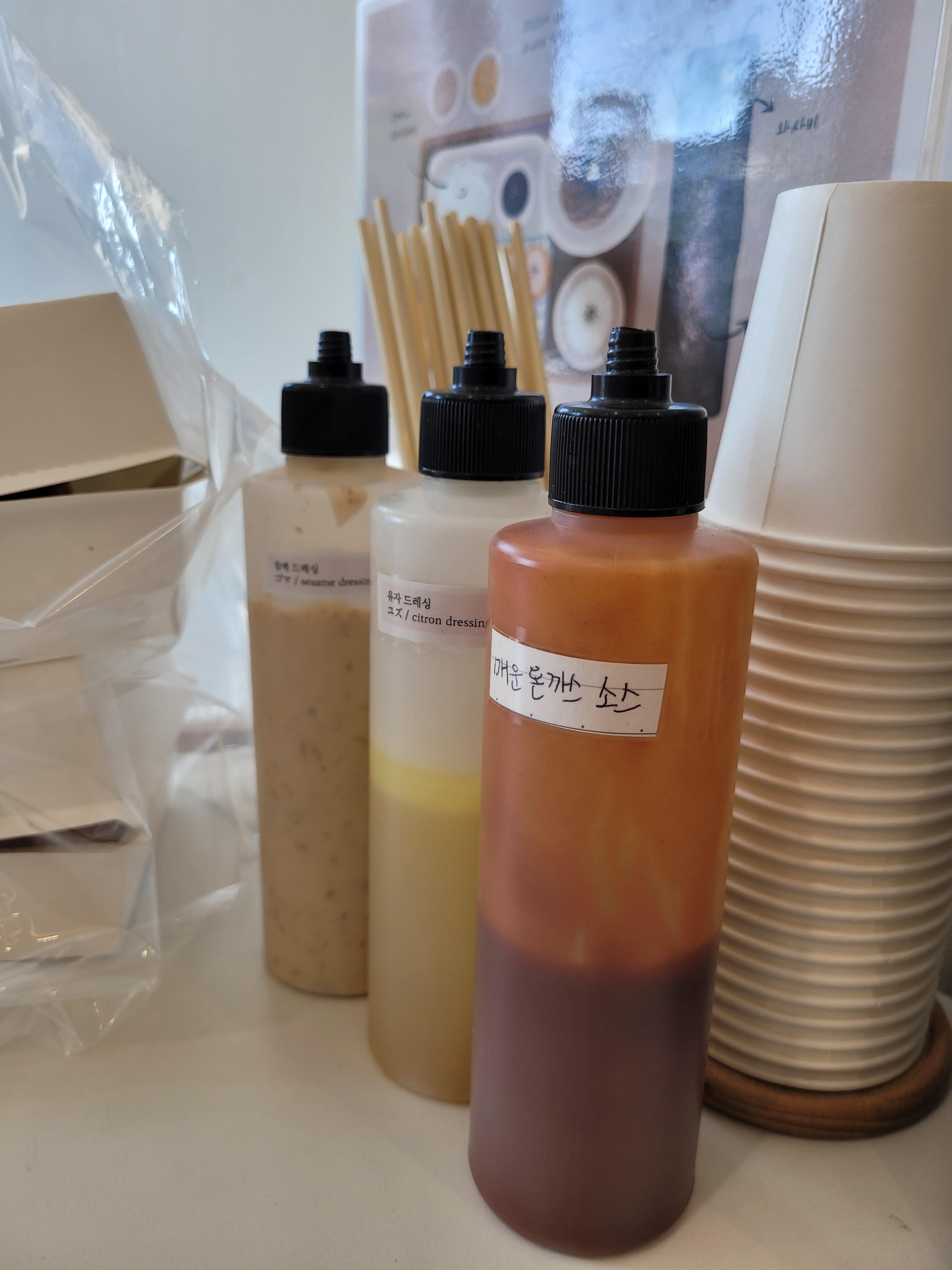 테이블 마다 소스가 3가지 있습니다. 양배추 소스 참깨드레싱, 유자 드레싱 있고 돈까스를 메콤하게 드실분들은 매운돈까스 소스도 있습니다. 아기랑 같이 먹는거라서 저는 참깨드레싱 쁘려서 먹었는데 고소하네요