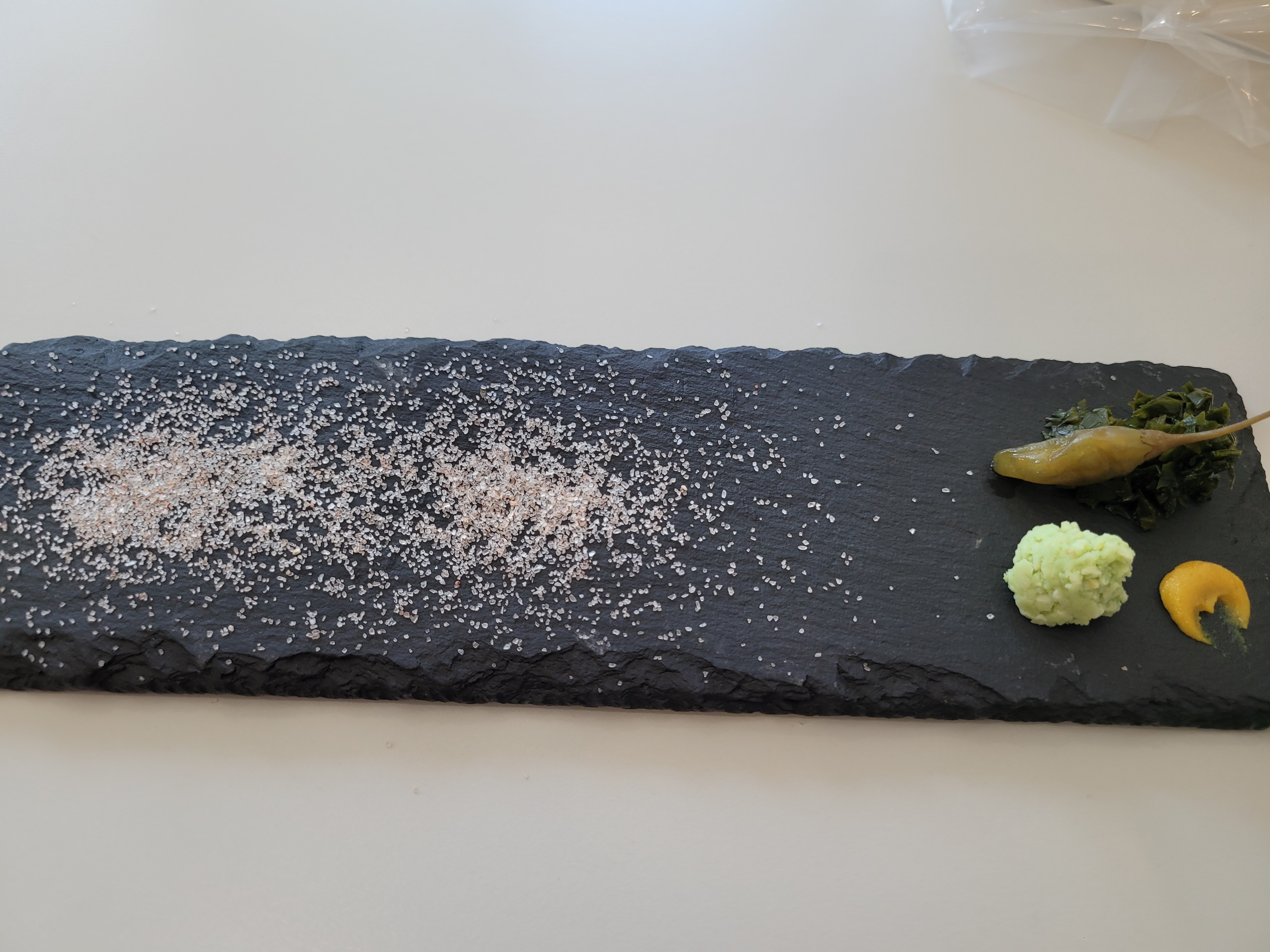 돈까스를 주문하면 먼저 곁들여 먹을 소금과 와사비,겨자 장아찌류가 담긴 접시를 줍니다.