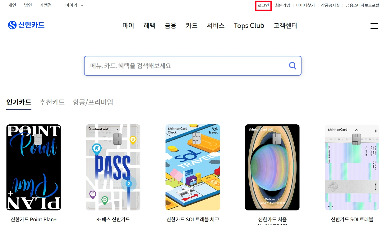 먼저 신한카드 홈페이지에 접속합니다. 회원가입이 되어있는 분들은 바로 로그인하셔도 되고, 회원가입이 되지 않더라도 공동인증서 인증을 통하여 쉽게 발급 할수 있습니다(신한카드 홈페이지 바로가기)