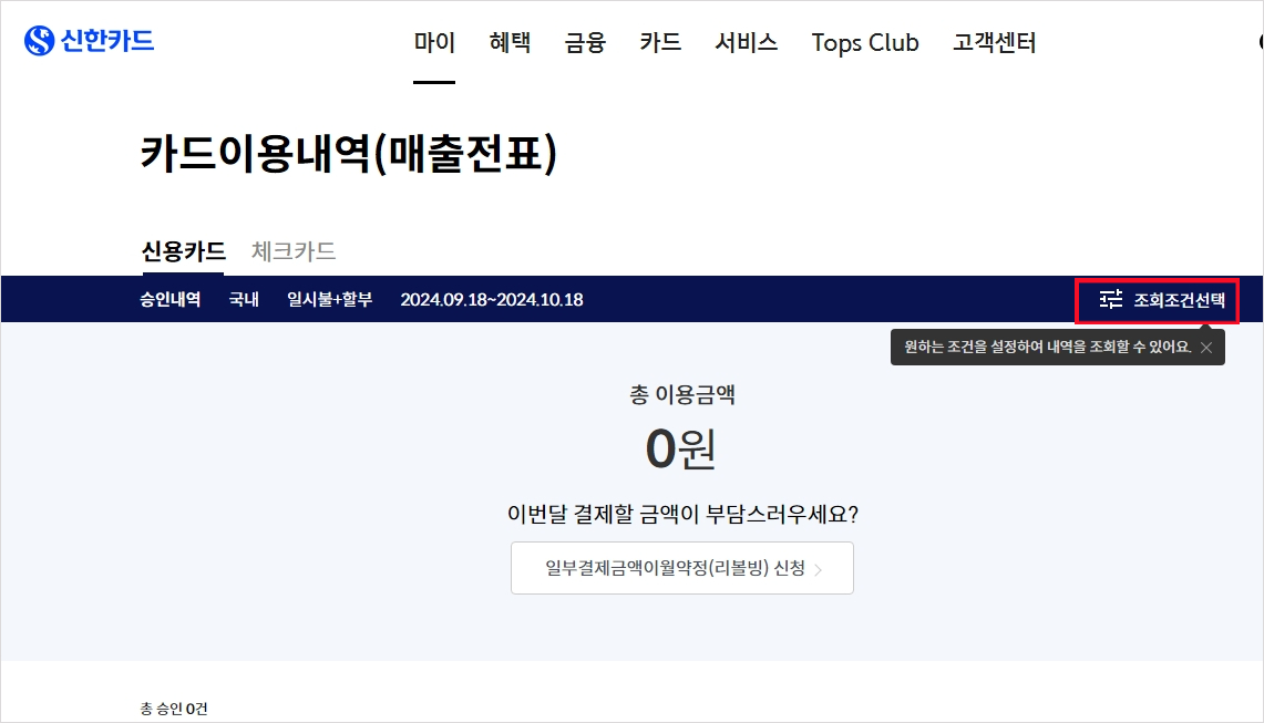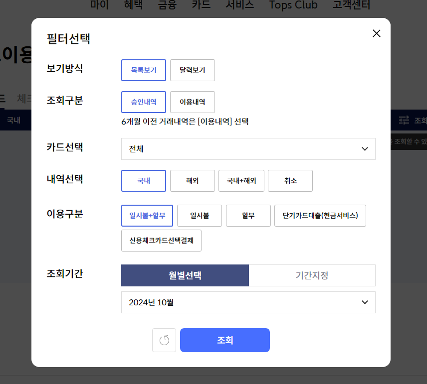 일단 홈페이지에서 확인하기 위해서는 "마이 > 카드이용내역(매출전표)"로 이동하면됩니다.