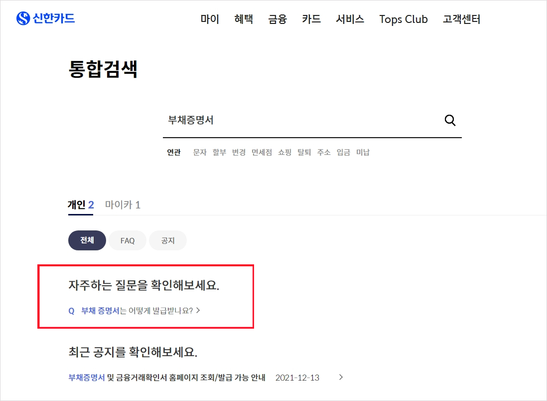 신한카드 부채증명서(금융거래잔액확인서) 발급방법