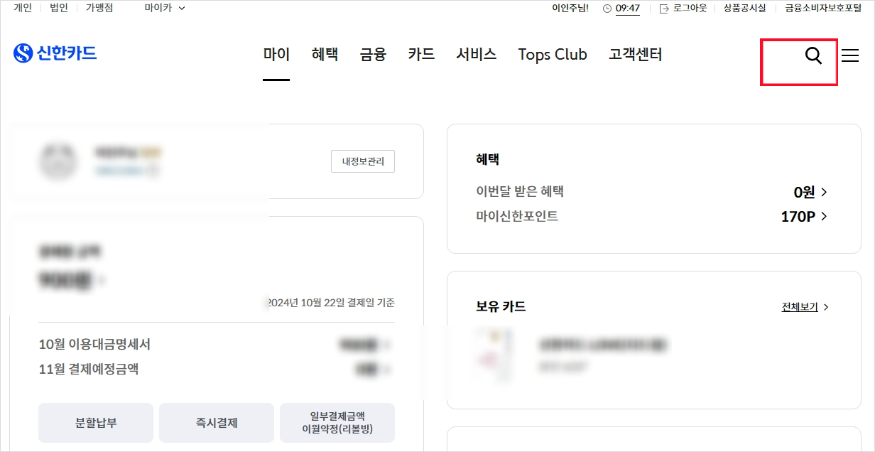 일단 홈페이지에서 확인하기 위해서는 "마이 > 카드이용내역(매출전표)"로 이동하면됩니다.